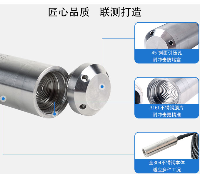 SIN-P260投入式液位變送器SIN-P260投入式液位變送器由高性能擴散硅壓阻式壓力傳感器作為測量元件,把與液位深度成正比的液體靜壓力準確測量出來,并經過信號調理電路轉換成標準(電流或電壓)信號輸出,建立起輸出信號與液體深度的線性對應關系,實現對液體深度的測量。產品精度高、體積小,直接投入液體中,即可測量出變送器末端到液面的液體高度,使用方便。適用于石油、化工、電廠、城市供水、水文勘探領域的液位測量與控制。經過長期老化及穩定性篩選,產品性能穩定可靠,能夠適用應用于環境比較惡劣的露天現場,同時能夠現場液位顯示,零點,滿程可遷移。
